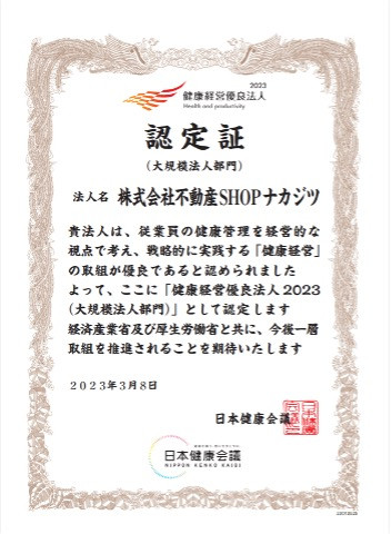 株式会社不動産SHOPナカジツ(本社:愛知県岡崎市、 代表取締役会長:鳥居守、 取締役社長:樗澤和樹)は経済産業省と日本経営会議が健康経営に積極的に取り組む優良企業を選定する「健康経営優良法人2023(大規模法人部門)」に2年連続で認定を受けました。